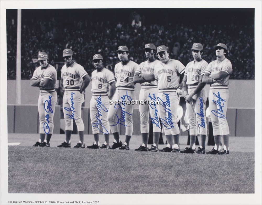Satin-finish 20 x 16 photo entitled The Big Red Machine, taken before Game 4 of the 1976 World Series, signed in blue felt tip by all eight members of the starting line-up pictured. Signers are: Pete Rose, Ken Griffey, Joe Morgan, Tony Perez, George Foster, Johnny Bench, Cesar Geronimo, and Dave Concepcion. Accompanied by a composite photo taken at time of private signing. In very fine condition. Auction LOA Steve Grad/PSA/DNA and R&R COA.
