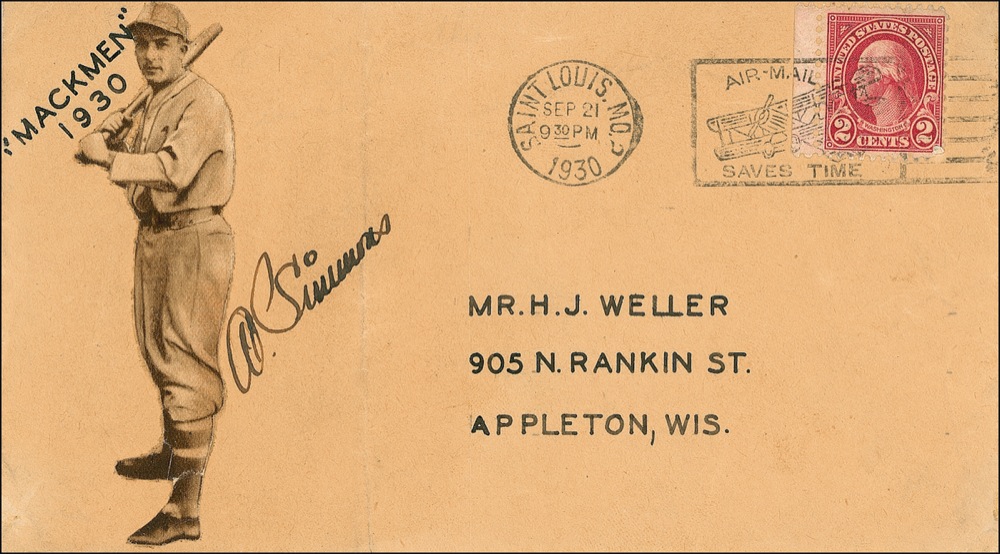 Baseball Hall of Famer who hit 307 home runs and had a .334 batting average. Mailing envelope, 6.5 x 3.75, postmarked September 21, 1930, signed on the front in black ink, “Al Simmons,” with a clipped photo of Simmons affixed next to signature. Vertical crease through a single letter of signature, and scattered light creases and wrinkles, otherwise fine condition. Auction LOA Steve Grad/PSA/DNA and RRAuction COA.