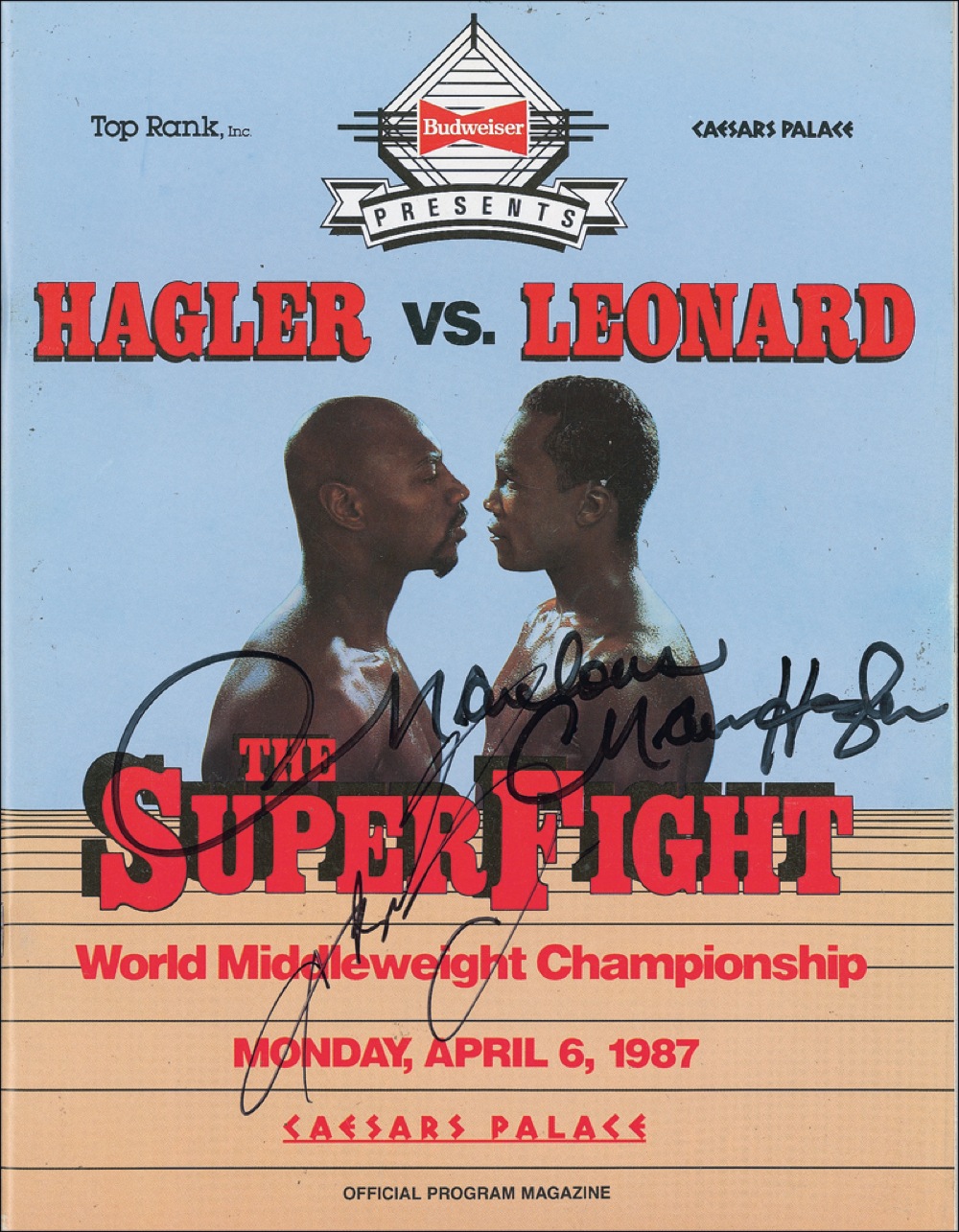 Program from the April 6, 1987, “Super Fight” between Sugar Ray Leonard and Marvelous Marvin Hagler at Caesar’s palace in Las Vegas, 8.5 x 11, 66 pages. Signed on the front cover in black felt tip by both Leonard and Hagler. In fine condition, with signatures slightly overlapping, and a bit of light handling wear. Auction LOA Steve Grad/PSA/DNA and RRAuction COA.