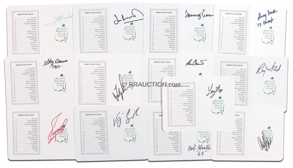 Thirteen unused Augusta National Golf Club score cards, each signed in ink or felt tip by a different Masters champion: Ben Crenshaw, Ray Floyd, Fred Couples, Ian Woosnam, Vijay Singh, Fuzzy Zoeller, Craig Stadler, Jose Maria Olazabel, Tommy Aaron, Gay Brewer, Bob Goalby, Doug Ford, and Larry Mize. In very fine condition. Auction LOA Steve Grad/PSA/DNA and R&R COA.