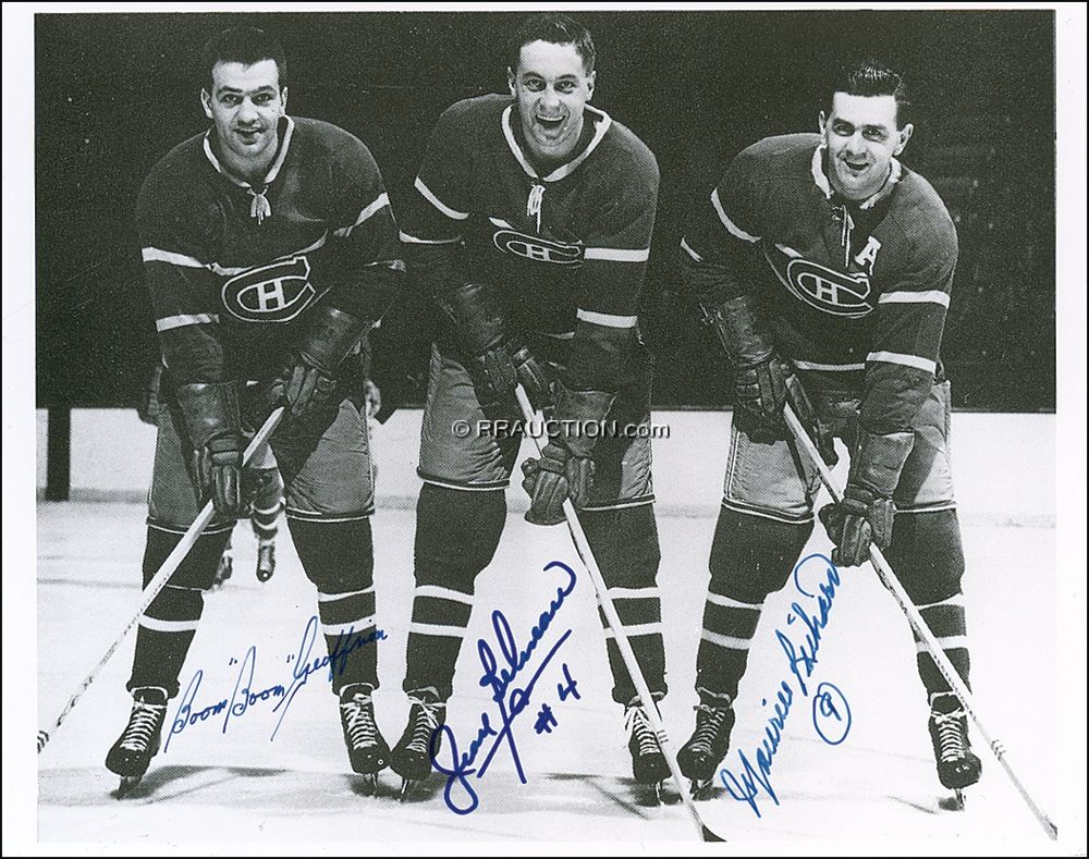 Glossy 10 x 8 photo of three CanadiEn legends, signed in blue felt tip by Boom Boom Geoffrion, Jean Beliveau, and Maurice Richard. In very fine condition. Auction LOA Steve Grad/PSA/DNA and R&R COA.