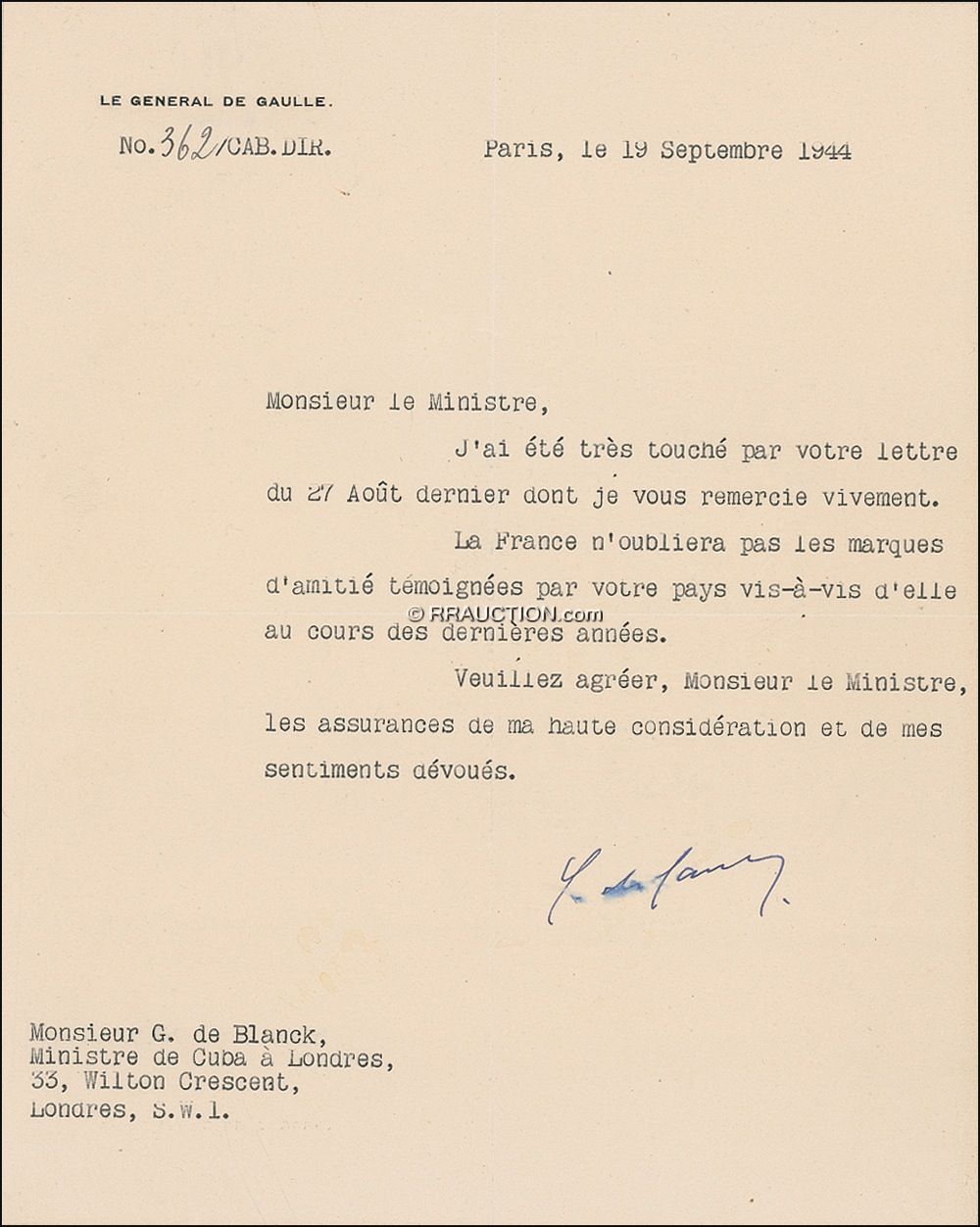 Esteemed French military leader and politician (1890–1970) who headed that country’s government during much of World War II and served again as prime minister in 1958–59. TLS signed “C. de Gaulle”,” one page, 8 x 10, personal letterhead, September 19, 1944. De Gaulle sends thanks to the Cuban Minister to London, G. de Blanck, for a letter, and notes that France will not forget the friendship shown by Cuba in recent years. Removably presented on a collector’s sheet with historical information, including an FDC and several postage stamps. In very good condition, with intersecting folds and blotting to a few letters of signature. R&R COA.