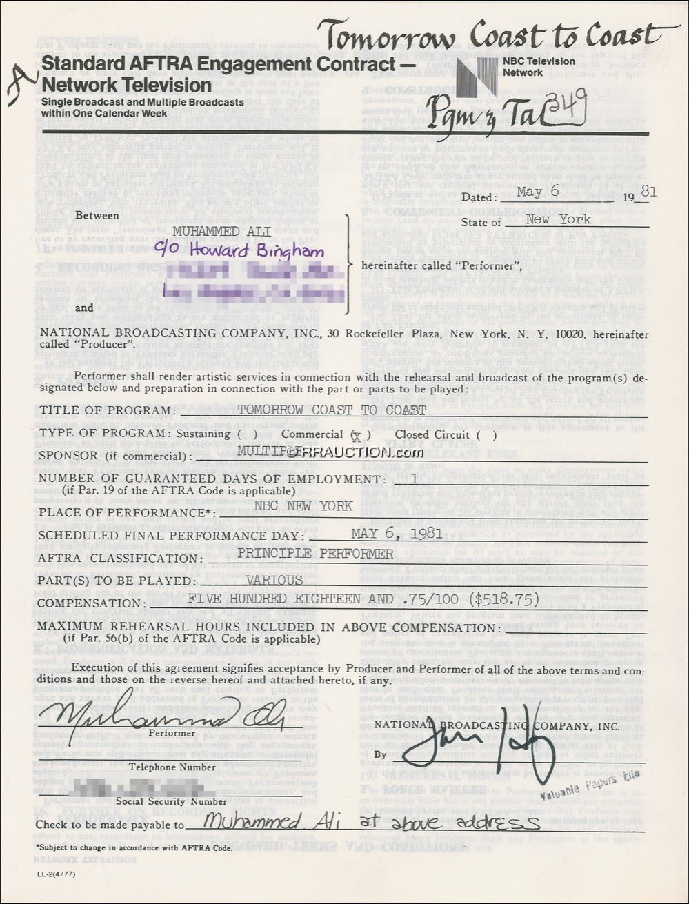 DS, two pages both sides, 8.5 x 11, May 6, 1981. Standard AFTRA television agreement between Ali and NBC for Ali to appear on Tomorrow Coast to Coast, for the salary of $518.75, signed at the bottom of the first page by Ali. Accompanied by a letter of authenticity from PSA/DNA. In fine condition, with a couple small office stamps and notations. R&R COA.