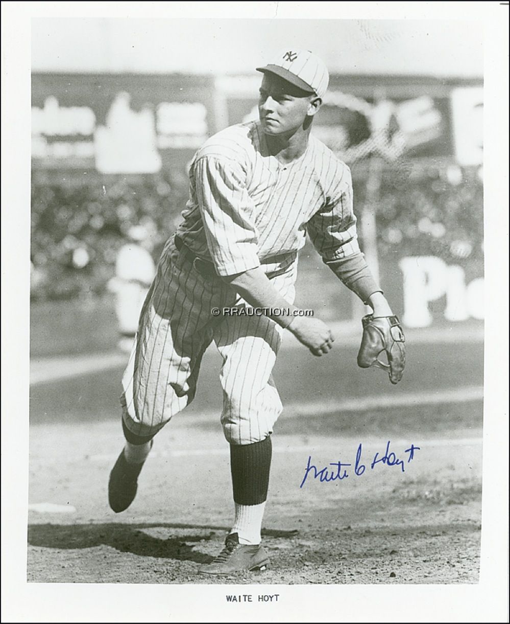 Glossy 8 x 10 photo of Hoyt on the mound for New York, signed in blue felt tip. Scattered light surface creases, and a small tear to top edge, otherwise fine condition. Auction LOA Steve Grad/PSA/DNA and R&R COA.