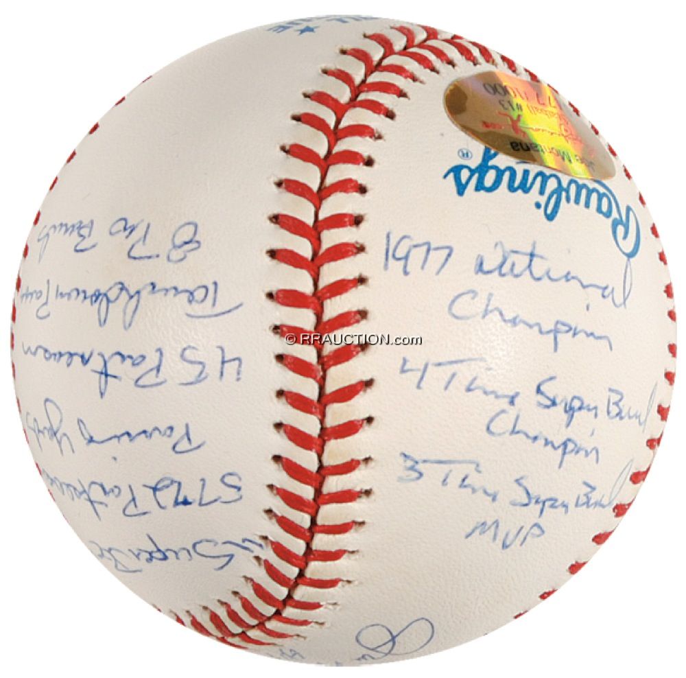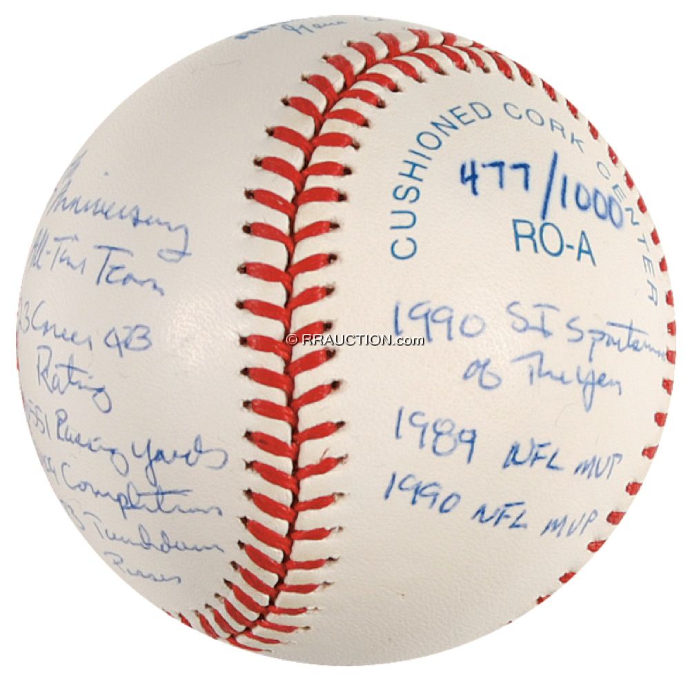 Limited edition official Rawlings American League Joe Montana ‘Statball’ baseball signed in blue ballpoint on the sweet spot, “Joe Montana HOF 2000,” with Montana adding 16 career statistics on the side panels of the ball. Accompanied by a certificate of authenticity from Reggiejackson.com, as well as its original box and cloth bag. In fine condition. Auction LOA Steve Grad/PSA/DNA and R&R COA.