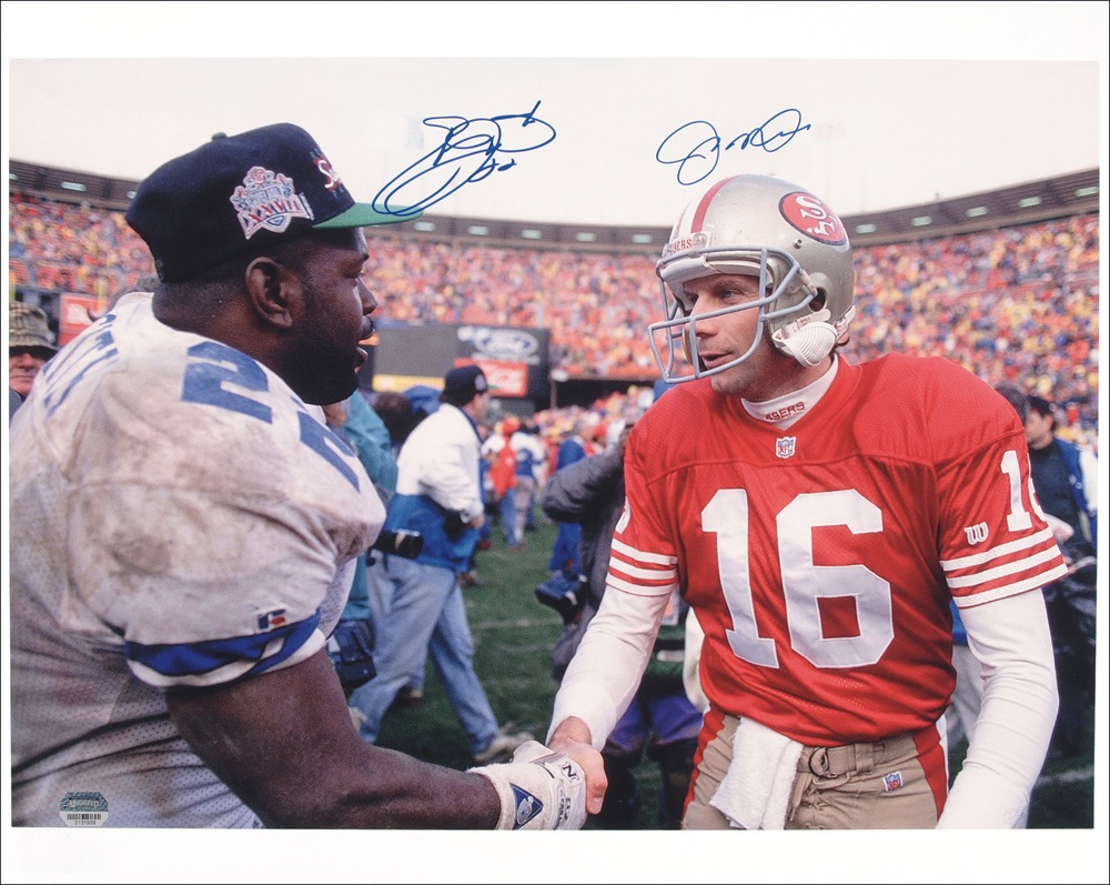 Color satin-finish 20 x 16 photo of Emmitt Smith and Joe Montana shaking hands after a game, signed in blue felt tip by both Smith and Montana. In fine condition, with a few scattered small surface creases. Auction LOA Steve Grad/PSA/DNA and RRAuction COA.