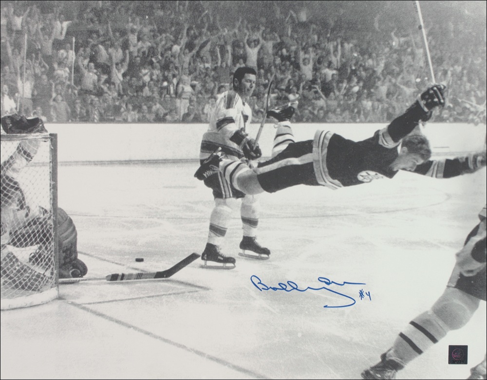 Glossy 20 x 16 photo of Orr scoring the Stanley Cup winning goal in 1970, signed in blue felt tip. Accompanied by a certificate of authenticity from Great North Road (Orr’s company). In very fine condition. Auction LOA Steve Grad/PSA/DNA and RRAuction COA.