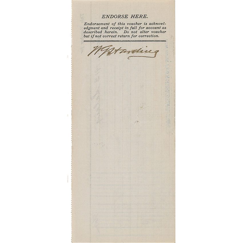 Two items: endorsed Harding Publishing Company check, filled out and signed in another hand, payable to Warren Harding for $260.00, dated June 27, 1913, and endorsed on the reverse, “W. G. Harding”; and a bank check, filled out in another hand and signed by Florence Kling Harding, dated October 28, 1914. Cancellation cuts to both, several creases to Mrs. Harding’s check, and some light spreading of ink to Harding’s endorsement, otherwise fine condition. Pre-certified John Reznikoff/PSA/DNA and RR Auction COA.