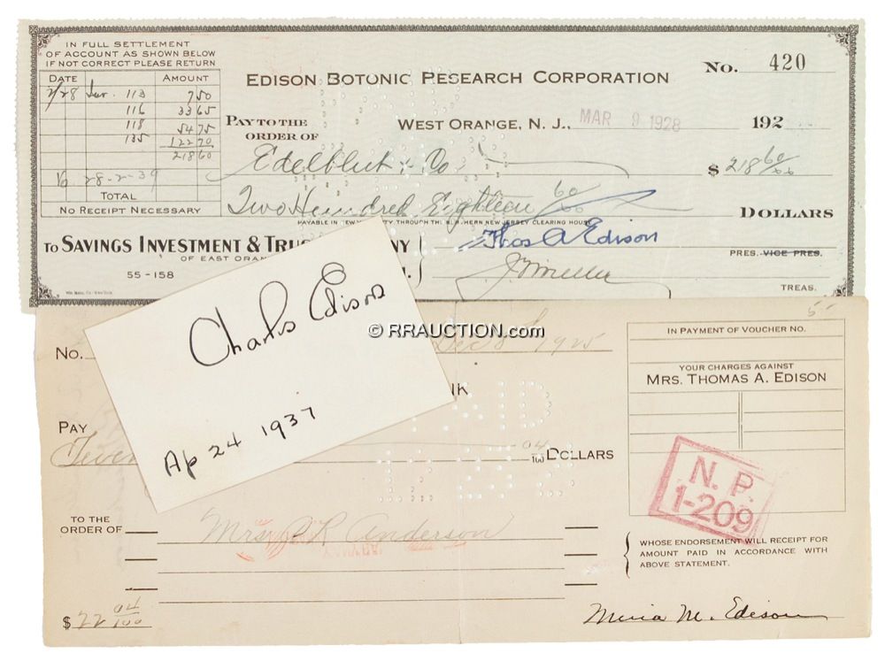 Three items: Edison Botanic Research Corporation check, 8.5 x 3, filled out in another hand and signed by Edison, “Thos. A. Edison,” payable to Edelblut & Co. for $218.60, stamp dated March 9, 1928; bank check filled out in another hand and signed by Mina M. Edison, dated December 8, 1925; and an ink signature, “Charles Edison,” on an off-white 3.25 x 2 card, dated April 24, 1937. In very good condition, with cancellation holes and creases lightly affecting Thomas’s signature, stamps and creases to both checks, and a bit of light toning to card from mounting remnants on reverse. R&R COA.