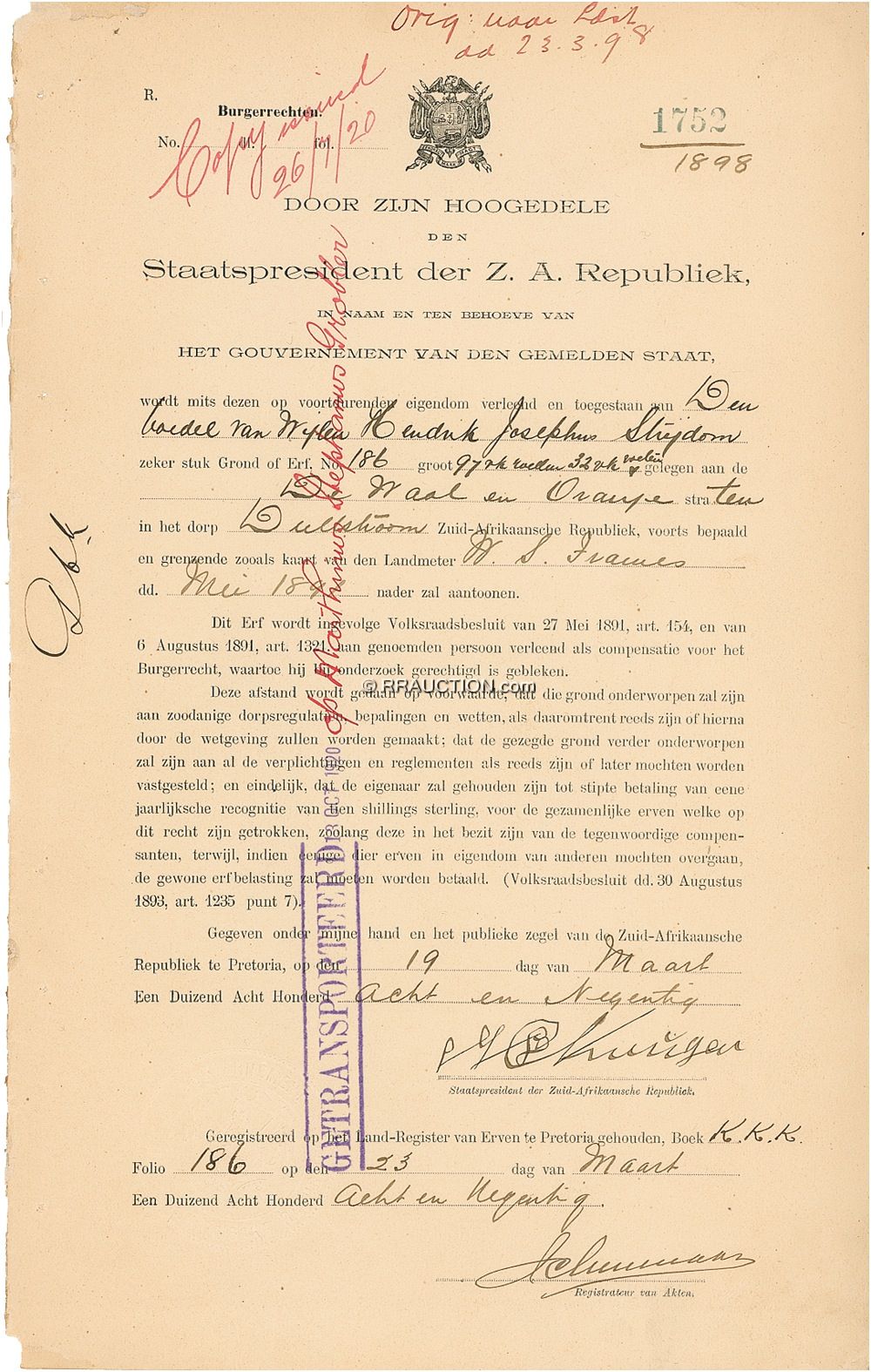 President of South Africa (1825–1904) from 1883–1900. Partly printed DS, one page, 8.5 x 13.5, March 19, 1898. An untranslated official document. In fine condition, with mild allover toning, and binding remnants to left edge. R&R COA.