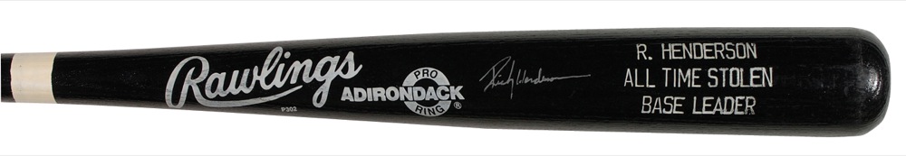Official Rawlings Adirondack Pro Ring Ricky Henderson commemorative baseball bat signed in silver ink on the barrel. In very fine condition. Auction LOA Steve Grad/PSA/DNA and RRAuction COA.