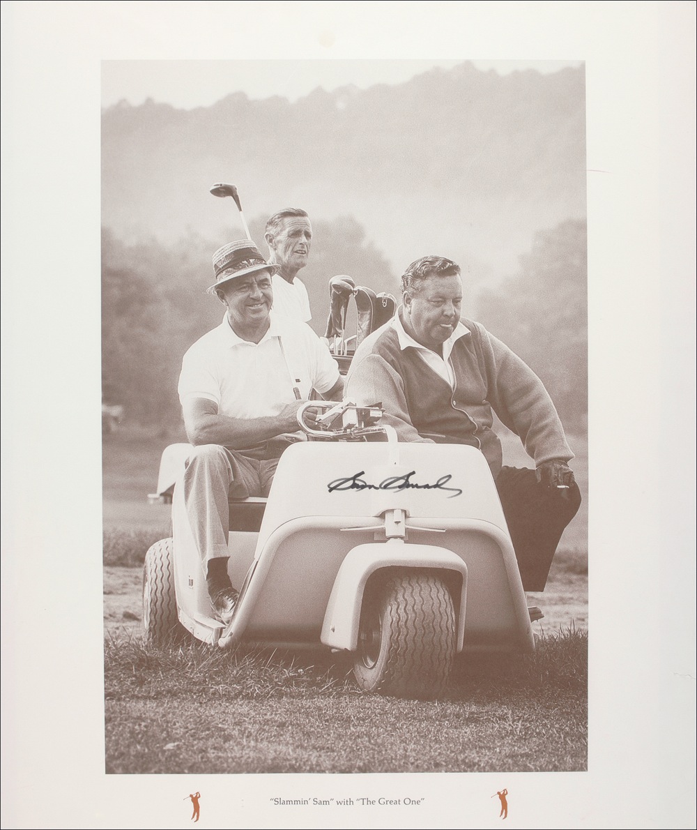 Print titled Slammin’ Sam with The Great One, showing Snead and Jackie Gleason in a golf cart on an early morning round of golf, 22 x 26, signed in black felt tip by Snead. In fine condition, with a small repairable tear to lower right edge. Pre-certified Steve Grad/PSA/DNA and RRAuction COA.