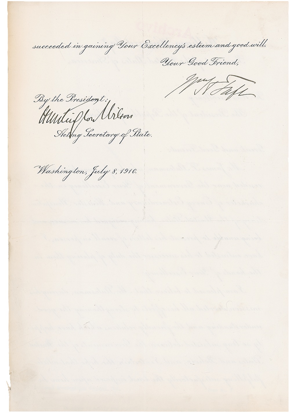 LS as President signed “Wm. H. Taft,” one page both sides, 9.5 x 14, July 8, 1910. Official letter of state to the president of Bolivia regarding the resignation of U. S. Envoy James F. Stutesman. In part: “Mr. James F. Stutesman…having resigned his mission and being unable to present his letters of recall in person, I have entrusted to his successor the duty of placing them in the hands of Your Excellency. I am pleased to believe that Mr. Stutesman, during his mission, devoted all his efforts to strengthening the good understanding and the friendly relations which have happily so long subsisted between the Governments of the United States and Bolivia.” In fine condition, with intersecting folds, office stamp to front, and a few chips to left edge. JSA/John Reznikoff Auction LOA and RRAuction COA.