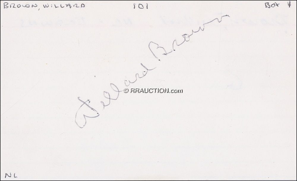 Baseball Hall of Famer who played with the Kansas City Monarchs. He was nicknamed ‘Home Run’ by Hall of Famer Josh Gibson for out-slugging Gibson in their head-to-head confrontations. Scarce ballpoint signature, “Willard Brown,” on an off-white 5 x 3 card. A bit of light skipping to signature, and collector’s notations to edges, otherwise fine condition. Uncommon signature as Brown ceased signing in 1990 due to Alzheimer’s Disease. Auction LOA Steve Grad/PSA/DNA and R&R COA.