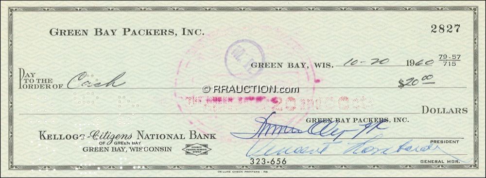 Green bay Packers business check, 8.25 x 3, filled out in another hand and signed by Lombardi, payable to Cash for $20.00, October 20, 1960. In fine condition, with cancellation holes to right side, and light show-through from bank stamp to center. Auction LOA Steve Grad/PSA/DNA and R&R COA.