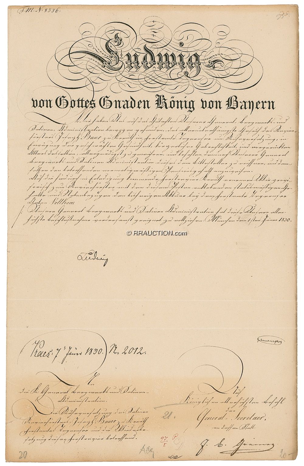 King of Bavaria (1786–1868) from 1825 to 1848. Ludwig abdicated during the Revolutions of 1848 in favor of his son, Maximilian II. Partly printed DS, in German, signed “Ludwig,” one page, 8.25 x 13, June 7, 1830. An untranslated official document. In very good condition, with creases, and light toning, soiling, and wrinkling, no faults affecting the signature. R&R COA.