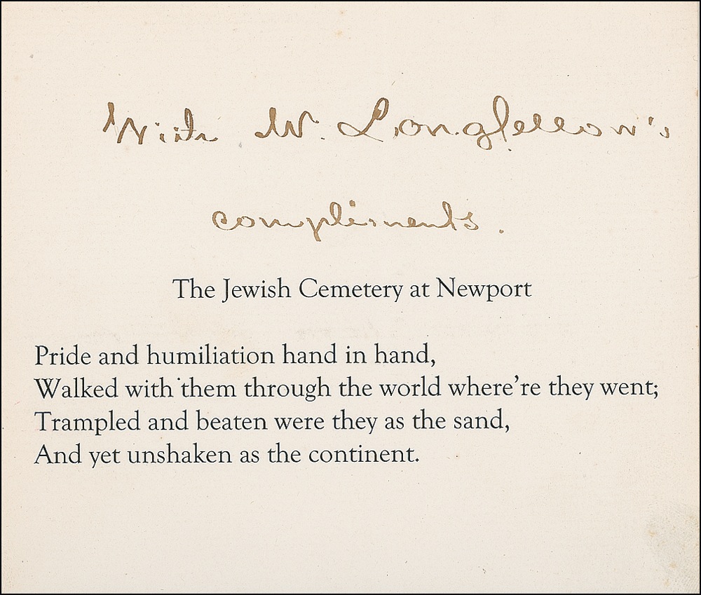 Ink signature, “With Mr. Longfellow’s compliments,” on an off-white 5 x 4.25 slip to which was later added a printed quotation from Longfellow’s poem “The Jewish Cemetery at Newport.” In fine condition, with light vertical fold and a hint of mild marginal soiling. RRAuction COA.