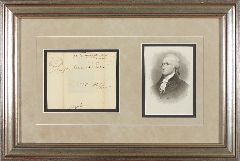 American statesman and politician (circa 1755–1804) who coauthored the Federalist Papers and served as the first secretary of the treasury. In July 1804, sitting vice president Aaron Burr, stung by a published criticism authored by Hamilton, challenged the esteemed statesman to a duel and fatally wounded him. Franking signature, “A. Hamilton,” on a 5.5 x 3 (panel size) postal cover addressed in another hand to Major John Adlum in Reading, Pennsylvania, and bearing “New York, August 27” and “PAID” postmarks; a notation in another hand identifies the dispatch as “on public service” (i.e., qualifying for the franking privilege). Archivally triple suede matted and framed with an engraved portrait of Hamilton, to an overall size of 19 x 13. Adlum (1759–1836), who served as a major in the Provisional Army during the Revolutionary War and eventually rose to the rank of brigadier general in the Pennsylvania militia, later pioneered the cultivation of wine grapes in America, aided in part by correspondence with amateur viticulturist Thomas Jefferson. In very good condition, with vertical folds (one just touching “n”), a touch of very subtle handling wear, toning and soiling, and seal-related tears and losses to flaps (away from address panel). JSA/John Reznikoff Auction LOA and RRAuction COA.