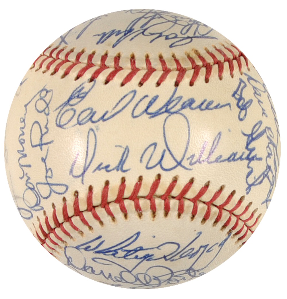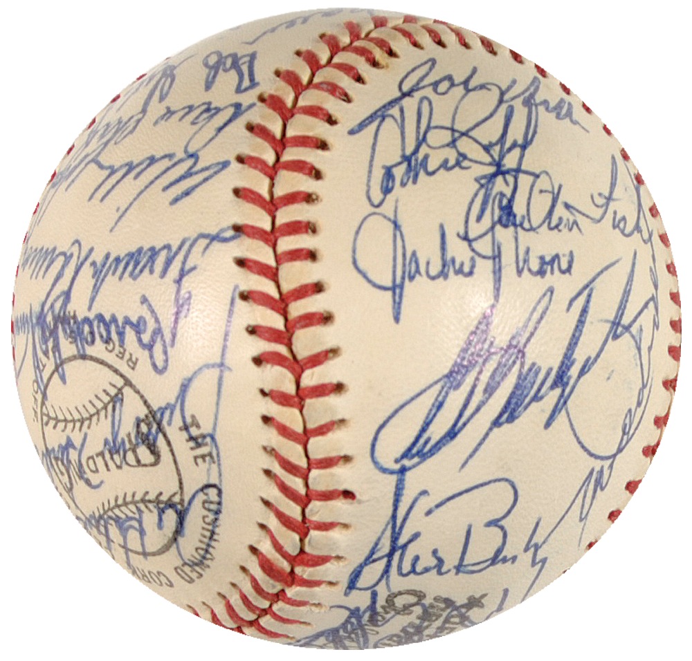 Official Spalding National League baseball signed in blue ballpoint on a side panel by Munson, and also signed by 32 members of the 1974 American League All Stars, including: Carl Yastrzemski, Earl Weaver, Frank Robinson, Brooks Robinson, Carlton Fisk, Rollie Fingers, Darrell Porter, Louis Tiant, Wilbur Wood, Bert Campaneris, Bob Grich, Joe Rudi, Don Money, Whitey Herzog, Bobby Murcer, and Gaylord Perry. Ball also bears a clubhouse signature of Dick Williams. In fine condition, with a mild shade of toning to Munson’s panel, and a couple signatures faded, but legible. Auction LOA Steve Grad/PSA/DNA and RRAuction COA.