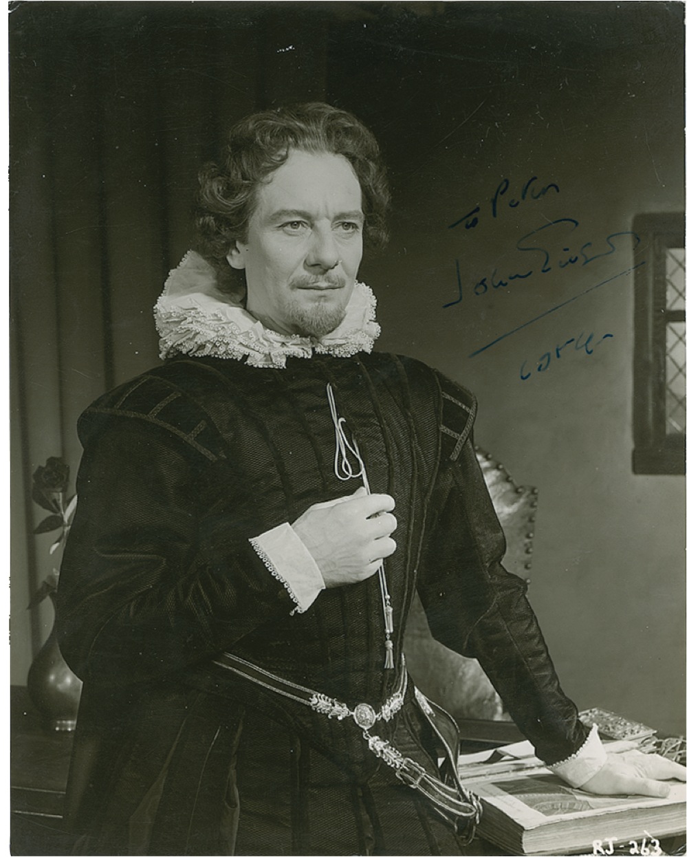 Vintage glossy 7.25 x 9.25 Rank publicity photo, signed and inscribed in ink, “To Peter, John Gielgud.” In very good condition, with possible neat trimming and scattered dings, surface marks, and small creases, and slightly indistinct contrast of ink. RRAuction COA.