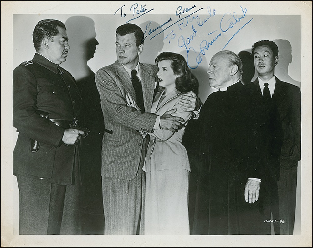 British-born character actor (1875–1959) who won the Academy Award for his supporting role as Kris Kringle in the holiday classic Miracle on 34th Street. Vintage glossy 10 x 8 photo, an original publicity still from the 1951 film Peking Express, signed and inscribed in ink “To Peter, Edmund Gwenn” and “To Peter, Good luck, Corinne Calvet.” In fine condition, with tiny creases, a few scattered dings and emulsion rubs, and mild soiling. RRAuction COA.