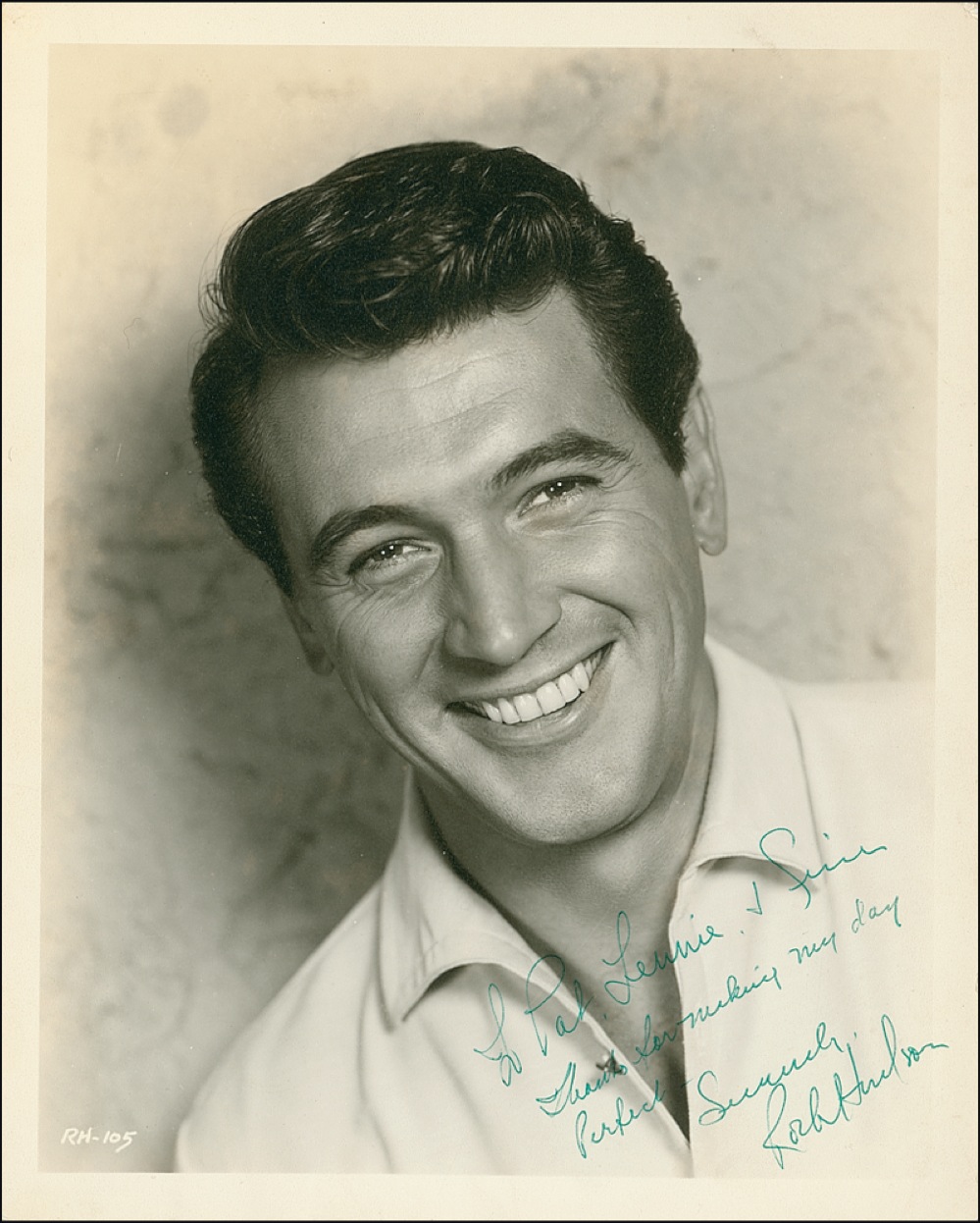 Vintage matte-finish 8 x 10 photo, signed and inscribed in green ink “To Pat, Lennie, & Jim, Thanks for making my day perfect. Sincerely, Rock Hudson.” In fine condition, with a couple light corner tip and surface creases. RRAuction COA.