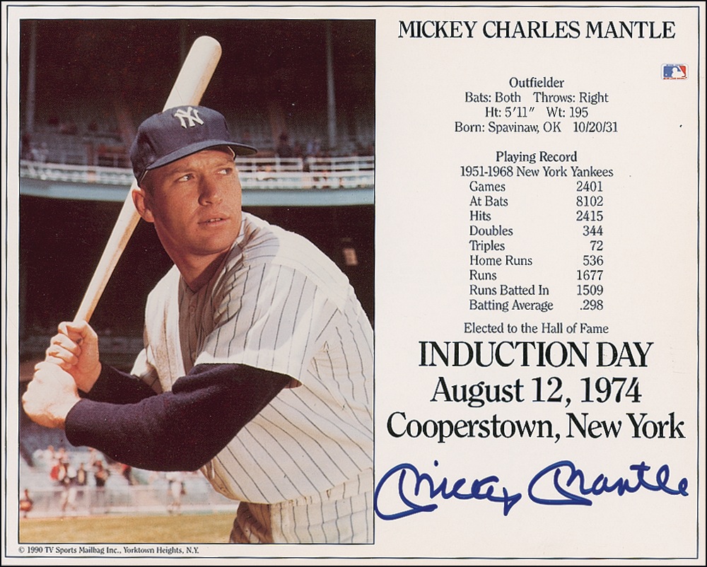 Color 10 x 8 cardstock photo, honoring Mantle’s 1974 induction into the Hall of Fame, complete with career statistics, nicely signed in blue felt tip, “Mickey Mantle.” In very fine condition. Auction LOA Steve Grad/PSA/DNA and RRAuction COA.