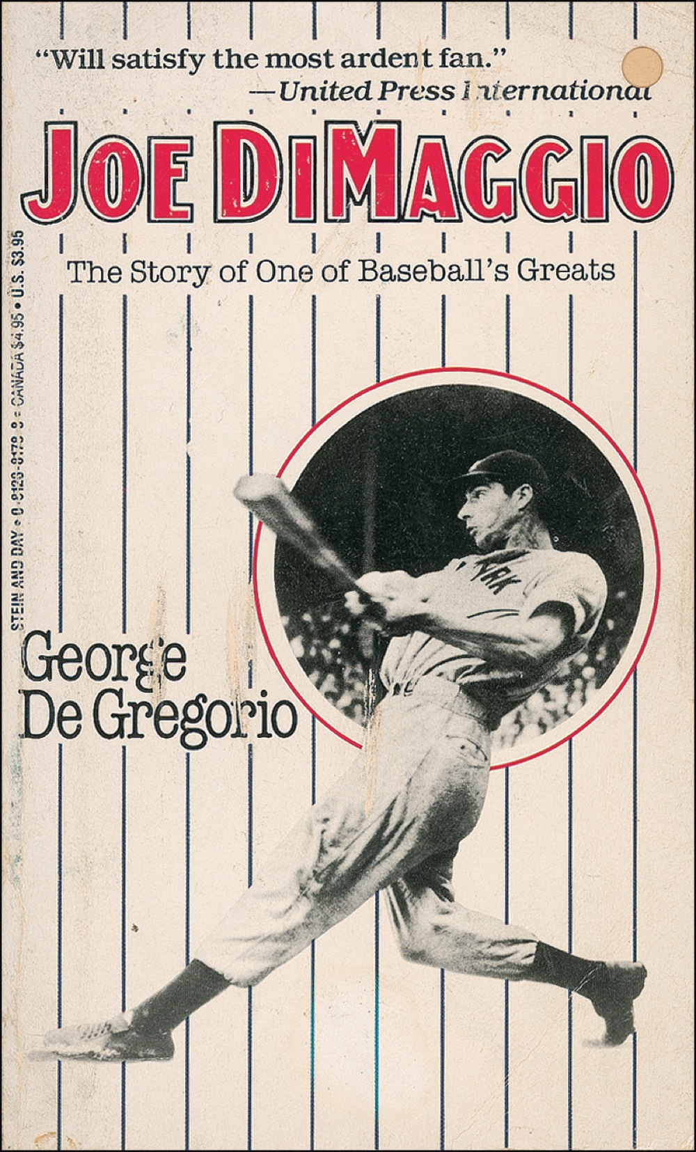 Two items: color 8 x 10 cardstock photo of an older DiMaggio in his Yankee pinstripes, signed in blue felt tip; and a paperback copy of Joe DiMaggio, signed in black ink on the first free end page by DiMaggio. In fine condition, with handling wear and a punch hole to front cover of book. Auction LOA Steve Grad/PSA/DNA and RRAuction COA.