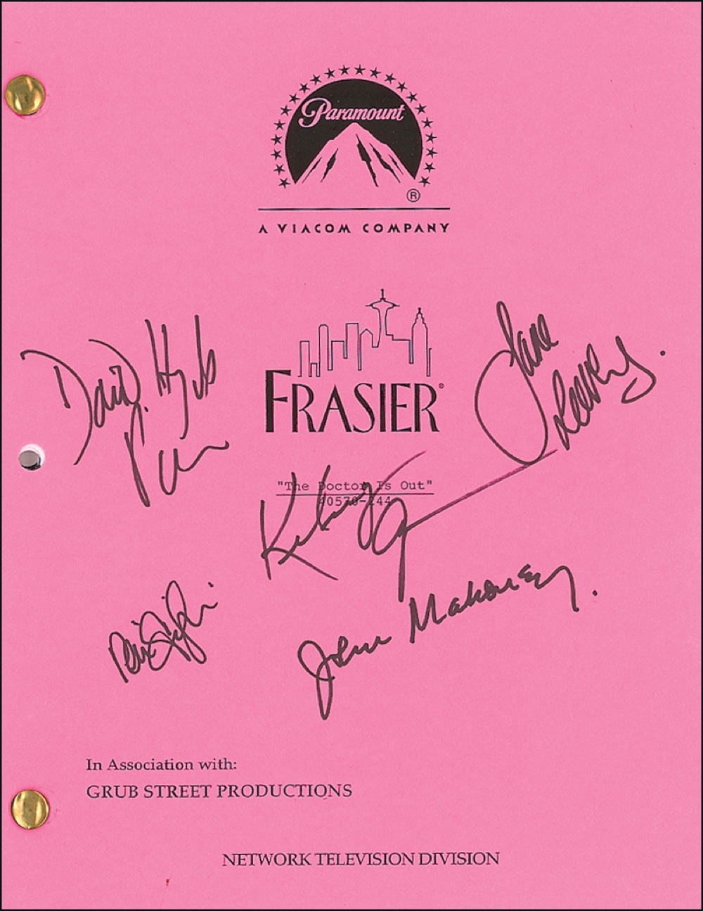 Brad-bound copy of a first draft script for an episode of Frasier titled “The Doctor is Out,” signed on the cover in black felt tip by Kelsey Grammer, David Hyde Pierce, John Mahoney, Jane Leeves, and Peri Gilpin. In fine condition. RRAuction COA.