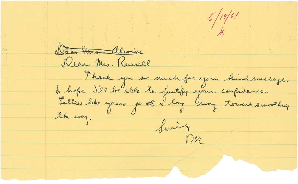ALS signed “RR,” evidently a draft prepared for a secretary, one lightly lined canary page, 8 x 4, dated in another hand June 19, 1967. Reagan writes to Mrs. Russell. In full: “Thank you so much for your kind message. I hope I’ll be able to justify your confidence. Letters like yours go a long way toward smoothing the way….” In very good condition, with irregularly torn bottom edge and tape-repaired complete tear near but not touching signature. RRAuction COA.