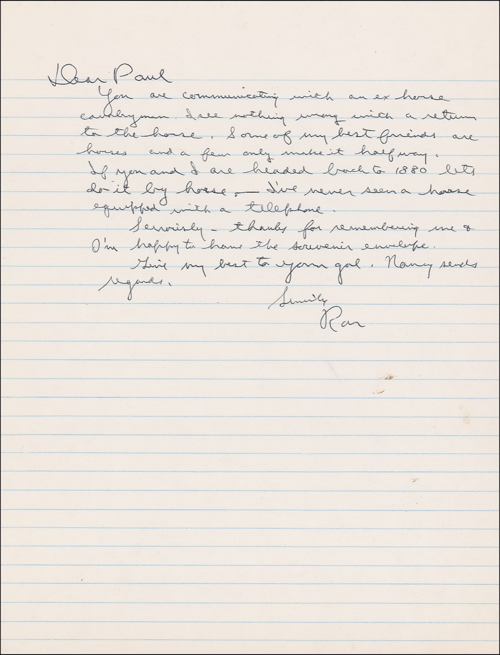 Good ALS signed “Ron,” evidently a draft prepared for a secretary, one lightly lined page, 8.5 x 11, no date. Reagan writes to Paul. In full: “You are communicating with an ex-horse cavalryman. I see nothing wrong with a return to the horse. Some of my best friends are horses and a few only make it halfway. If you and I are headed back to 1880 let’s do it by horse—I’ve never seen a horse equipped with a telephone. Seriously—thanks for remembering me & I’m happy to have the souvenir envelope. Give my best to your gal. Nancy sends regards.” A few tiny stains to blank portions, otherwise fine condition. RRAuction COA.
