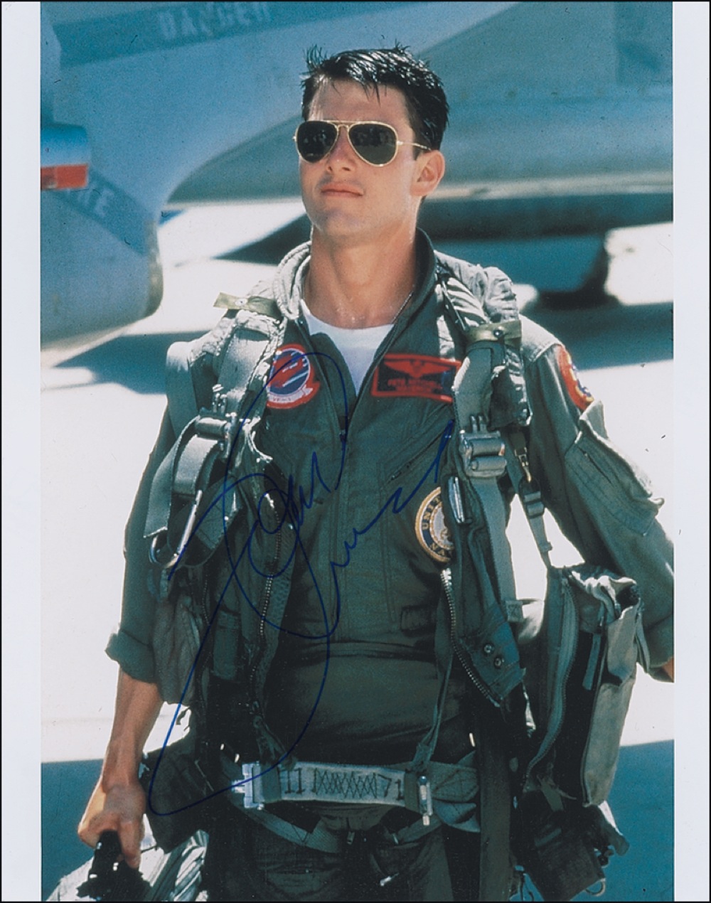 Color glossy 11 x 14 photo in his Top Gun role, signed in blue felt tip. Slightly indistinct contrast against background, otherwise very fine condition. RRAuction COA.