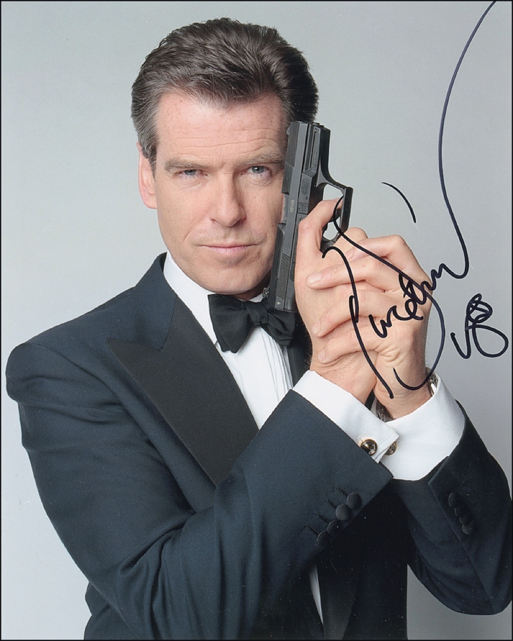 Color glossy 8 x 10 photo of Brosnan as Bond, signed in black felt tip “Pierce Brosnan 08.” In very fine condition. RRAuction COA.