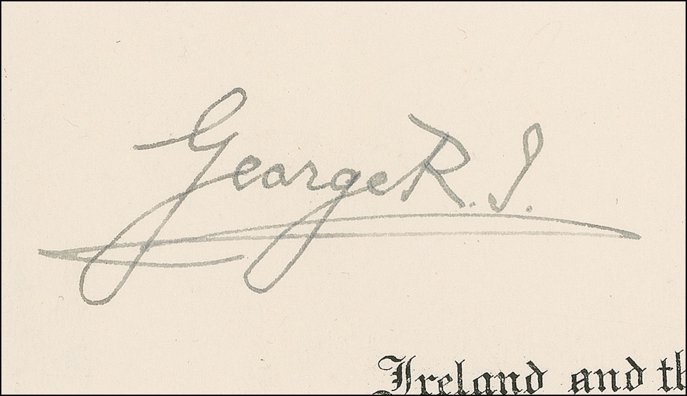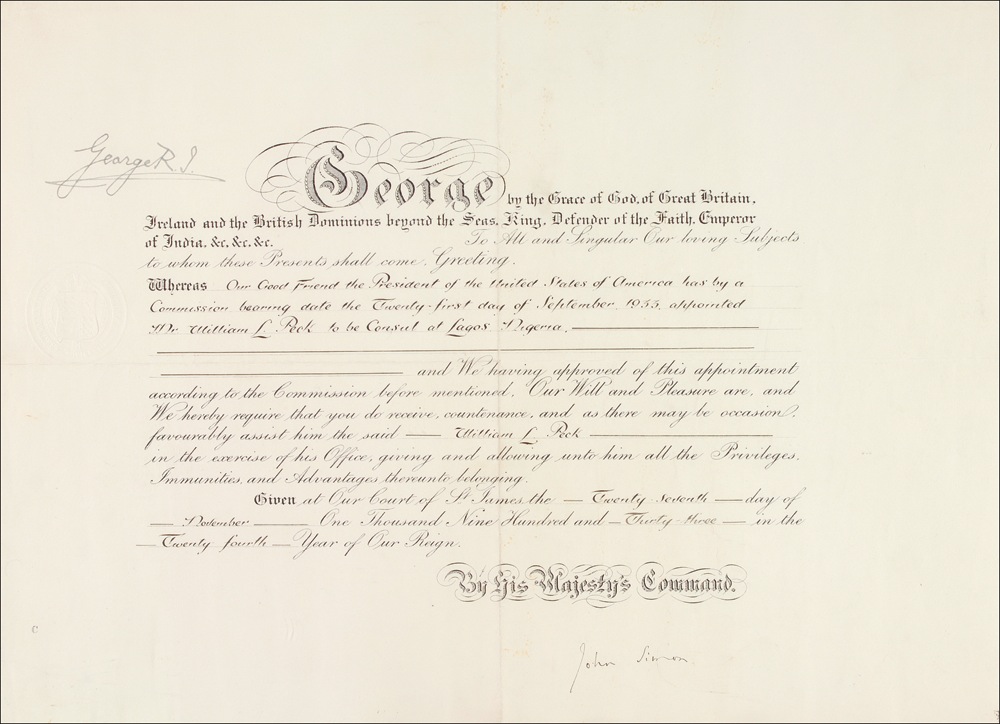 King of Great Britain and Northern Ireland (born 1865) who reigned from 1910 until his death in 1936. DS, signed “George R. I.,” one page, 18.25 x 13.5, November 27, 1933. A document approving the appointment of William L. Peck as the American Consul at Lagos, Nigeria. Countersigned by John Simon. Intersecting folds and some minor soiling (light spotting to top margin), otherwise fine condition. RRAuction COA.