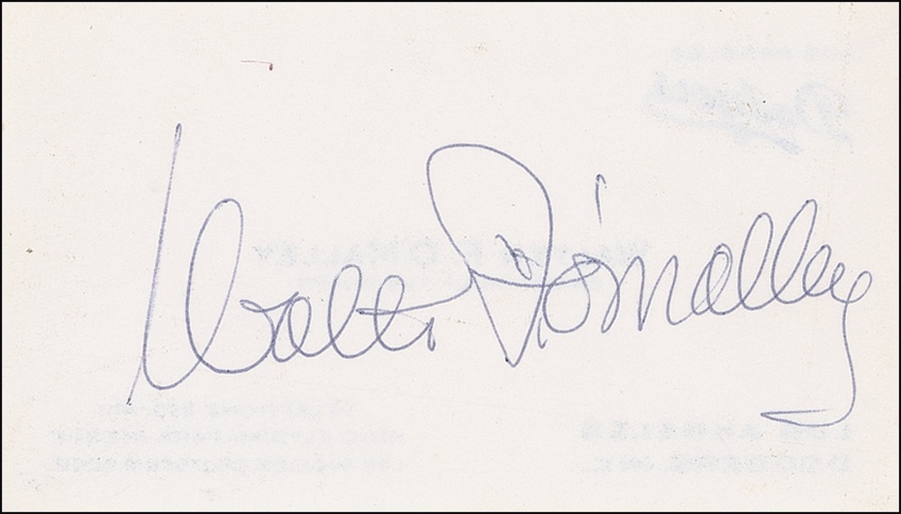 President of the Brooklyn Dodgers. O’Malley was the man responsible for firing Branch Rickey and the team’s unpopular move from New York to Los Angeles. A Walter O’Malley Los Angeles Dodgers business card, 3.5 x 2, signed on the reverse in blue ballpoint by O’Malley. In fine condition, with some mild handling wear. Auction LOA Steve Grad/PSA/DNA and RRAuction COA.