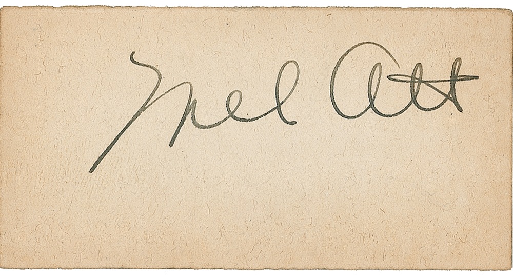 New York Giants hero for 22 seasons, during which he emerged as one of the game’s leading sluggers and a fan favorite. Vintage ink signature, “Mel Ott,” on an off-white 3 x 1.5 card. In fine condition, with mild overall toning. Auction LOA Steve Grad/PSA/DNA and RRAuction COA.