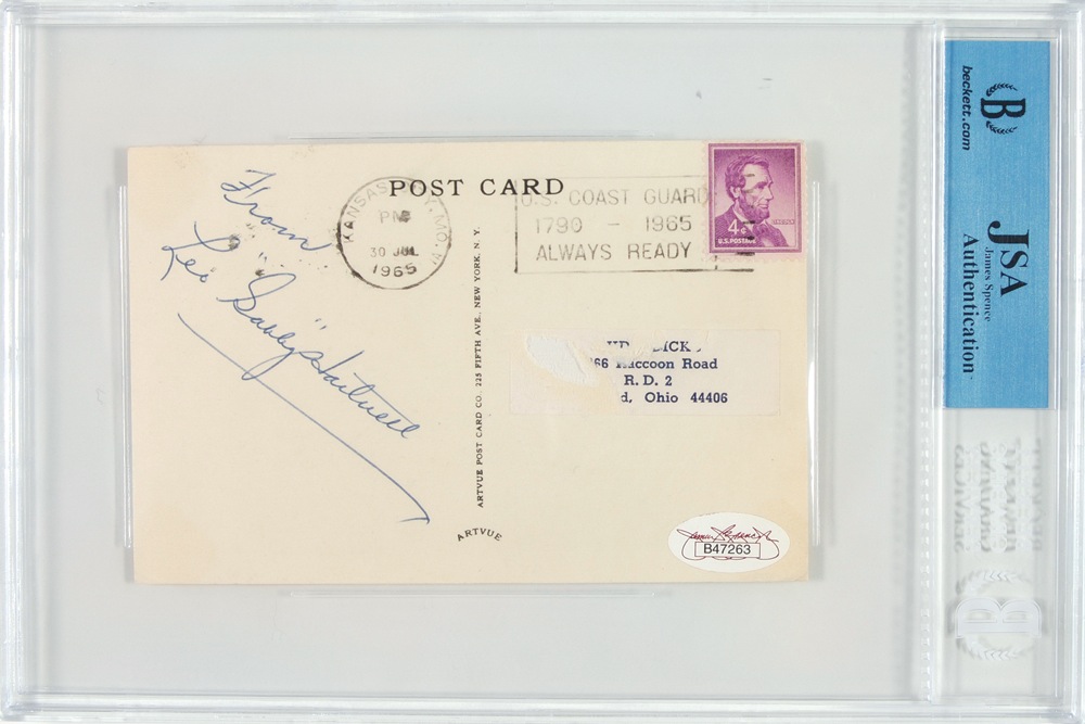 Hall of Famer with the Chicago Cubs and 1935 MVP. Black and white Hall of Fame plaque card signed along the bottom in blue ballpoint, “Leo Gabby Hartnett,” and also signed again on the reverse “From Leo ‘Gabby’ Hartnett.” Encapsulated in a plastic James Spence authentication holder. In fine condition. Auction LOA Steve Grad/PSA/DNA and RRAuction COA.