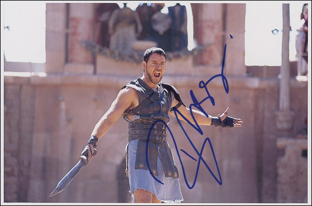 Color satin-finish 12 x 8 photo of Crowe from Gladiator, signed in-person in blue felt tip. In very fine condition. RRAuction COA.