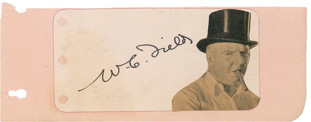 Vintage fountain pen signature, “W. C. Fields,” on an off-white 4 x 2 album page, affixed to a slightly larger light pink slip. In fine condition, with a bit of mild toning and wrinkling. PSA/DNA Auction LOA and RRAuction COA.