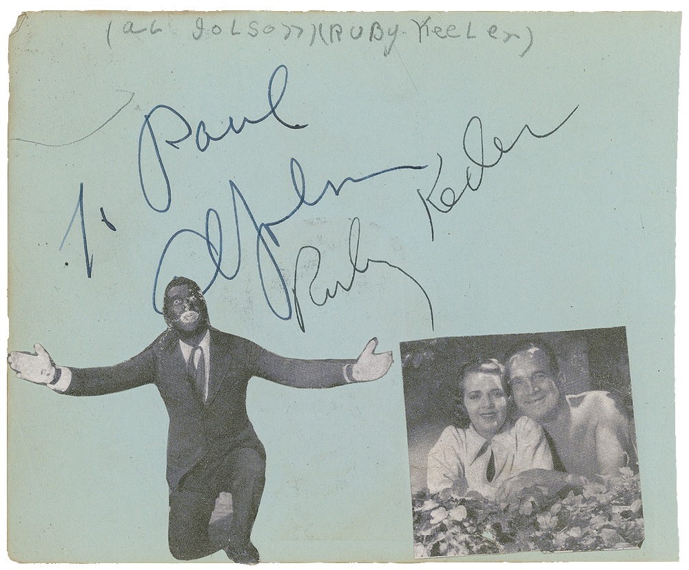 Vintage fountain pen signature and inscription, “To Paul, Al Jolson,” on a light green 5.5 x 4.5 album page, with a Ruby Keeler signature under Jolson’s. In very good condition, with clipped photo over opening letter of signature, pencil notations to top, and some scattered mild toning and wrinkling. RRAuction COA.