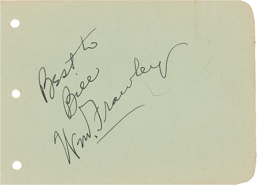 Played Fred in I Love Lucy. Vintage fountain pen signature and inscription, “Best to Bill, Wm. Frawley,” on a light green 6 x 4.25 album page. In fine condition, with punch holes to left edge. RRAuction COA.
