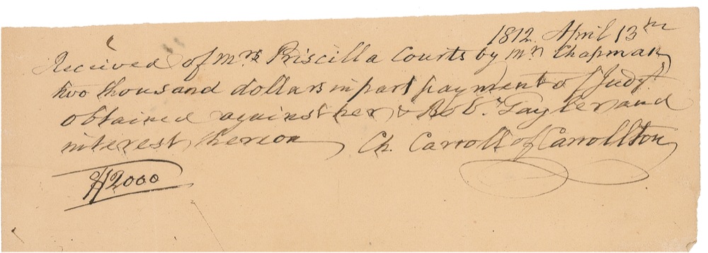 Signer of the Declaration of Independence from Maryland (1737–1832) who was the last survivor among his colleagues. ADS, signed “Ch. Carroll of Carrolton,” one page, 8 x 2.75, April 13, 1812. Receipt for payment received. In full: “Received from Mrs. Priscilla Courts by M. N. Chapman two thousand dollars in payment of judgt. obtained against her and Robt. Tayler and interest thereon.” Mild overall toning, two light vertical folds, and a few light creases, otherwise fine condition. Auction LOA John Reznikoff/PSA/DNA and RRAuction COA.