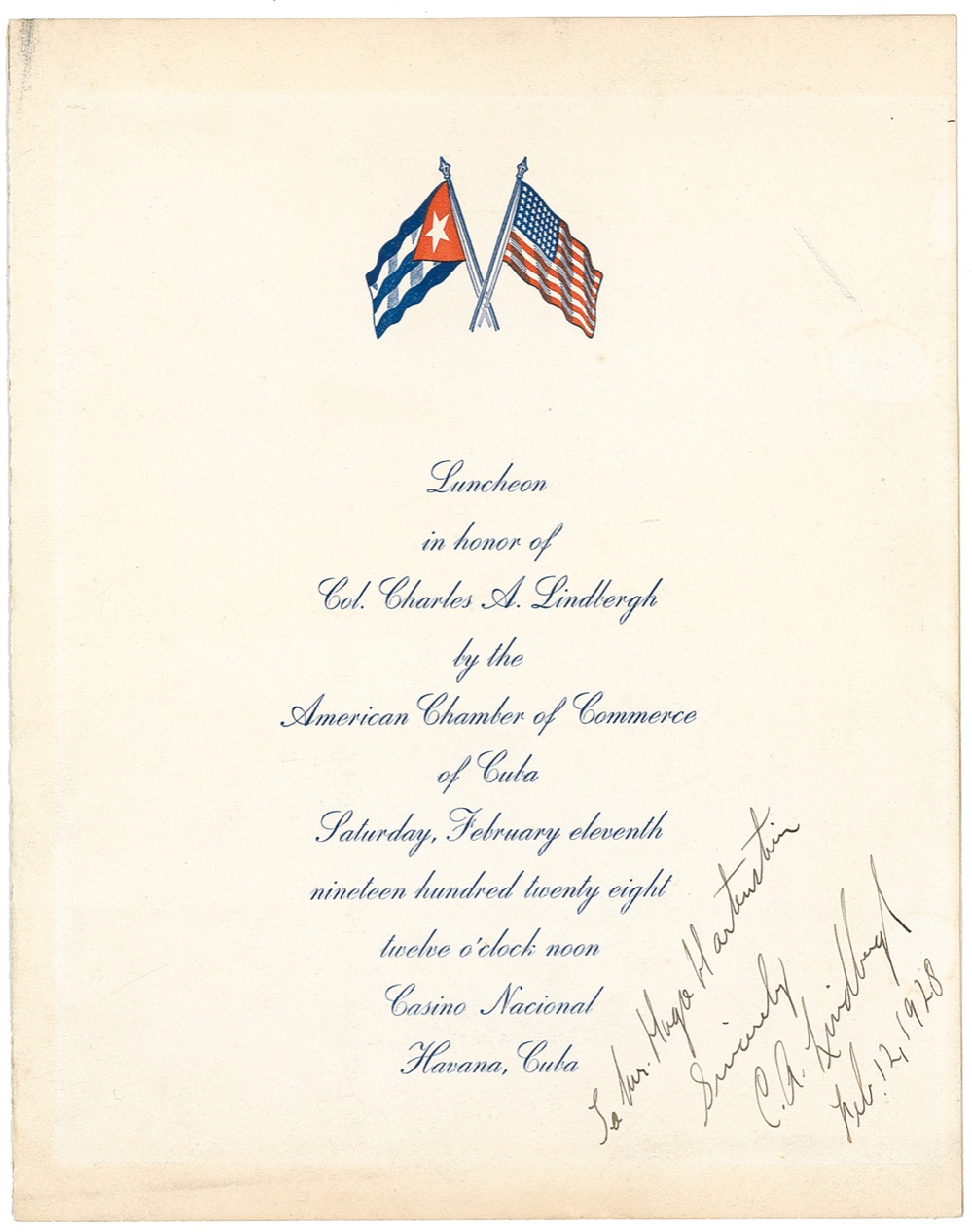 Menu from a luncheon held in honor of Lindbergh by the American Chamber of Commerce at the Casino Nacional in Havana, 8.5 x 11, February 11, 1928, signed and inscribed on the cover in fountain pen, “To Mr. Hugo Hartenstein, Sincerely, C. A. Lindbergh, Feb. 12, 1928.” The cover bears crossed Cuban and American flags. One panel of the interior bears a large halftone photo of Lindy posing with the Spirit of St. Louis; the opposite menu panel bears an affixed printed table placard reading “Señor President Camara de Comercio Americana.” Lindbergh was then in Cuba near the end of an extended Latin-American goodwill tour that had begun in the previous December. It was during the Mexican leg of the tour, a few months before he arrived in Cuba, that Lindbergh met Anne Morrow, who became his wife in 1929. A touch of light toning and soiling to edges of cover from previous display, light offsetting to interior from photo, and mounting remnants to back cover, otherwise fine condition. Handsome for display! RRAuction COA.