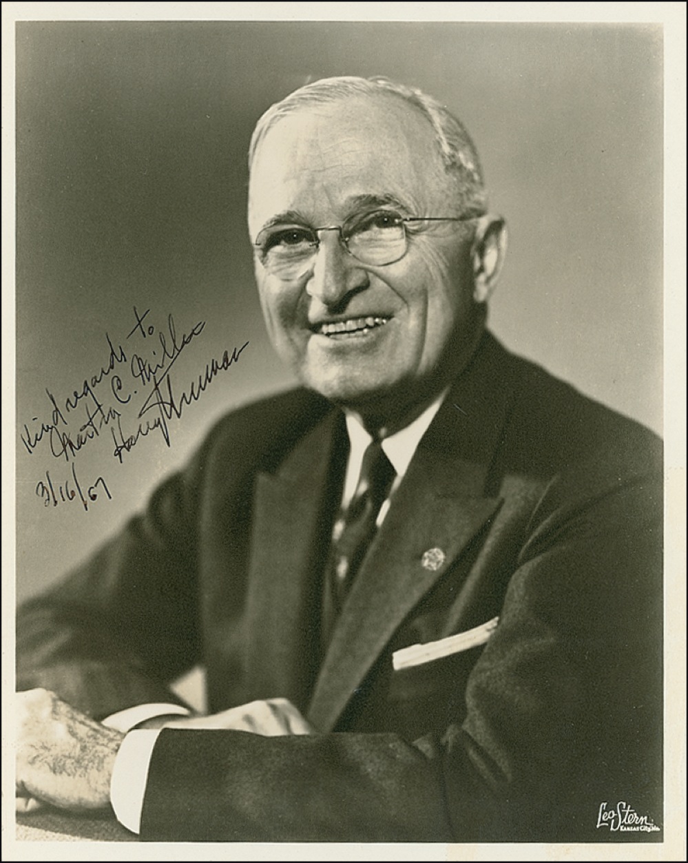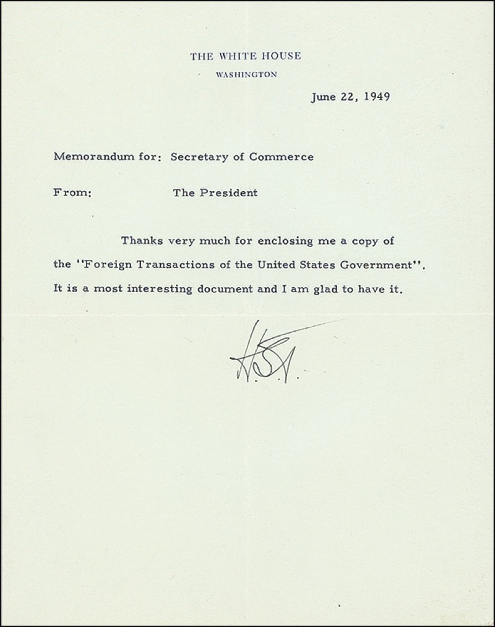 Two items: White House memo, signed “H. S. T.,” as president, sending thanks to the Secretary of Commerce for a gift of a book; and a vintage matte-finish 8 x 10 photo, signed and inscribed in black ink, “Kind regards to Martha C. Milles, Harry S. Truman 3/16/67.” In fine condition, with intersecting folds to memo, and a horizontal crease above inscription on photo. Auction LOA John Reznikoff/PSA/DNA and RRAuction COA.