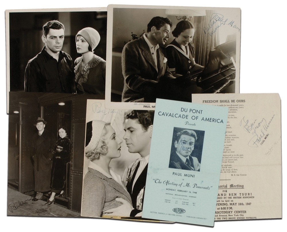 Six items: four vintage photos ranging in size from 7.25 x 9 to 10 x 8, including one from Scarface, each signed in ink (one also signed by Bella Muni”; and two 1940s programs or program pages, each signed in ink (one also inscribed). In good to very good condition, with scattered trimming, creases, dings, tape remnants, and tears to photo (creases to two signatures), and folds (touching one signature), soiling, and handling wear to programs. RRAuction COA.