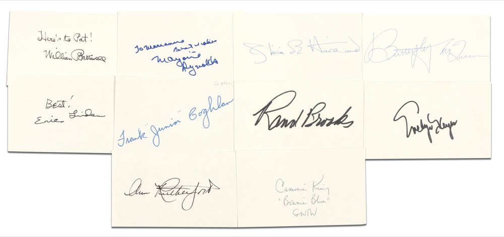 Ink and felt tip signatures of 10 Gone with the Wind cast members on individual off-white 5 x 3 cards. Signers are: Olivia deHavilland, Butterfly McQueen, Eric Linden, Marjorie Reynolds (ins), Frank Coghlan, Rand Brooks, William Bakewell (ins), Evelyn Keyes, Ann Rutherford, and Cammie King. In fine condition. RRAuction COA.