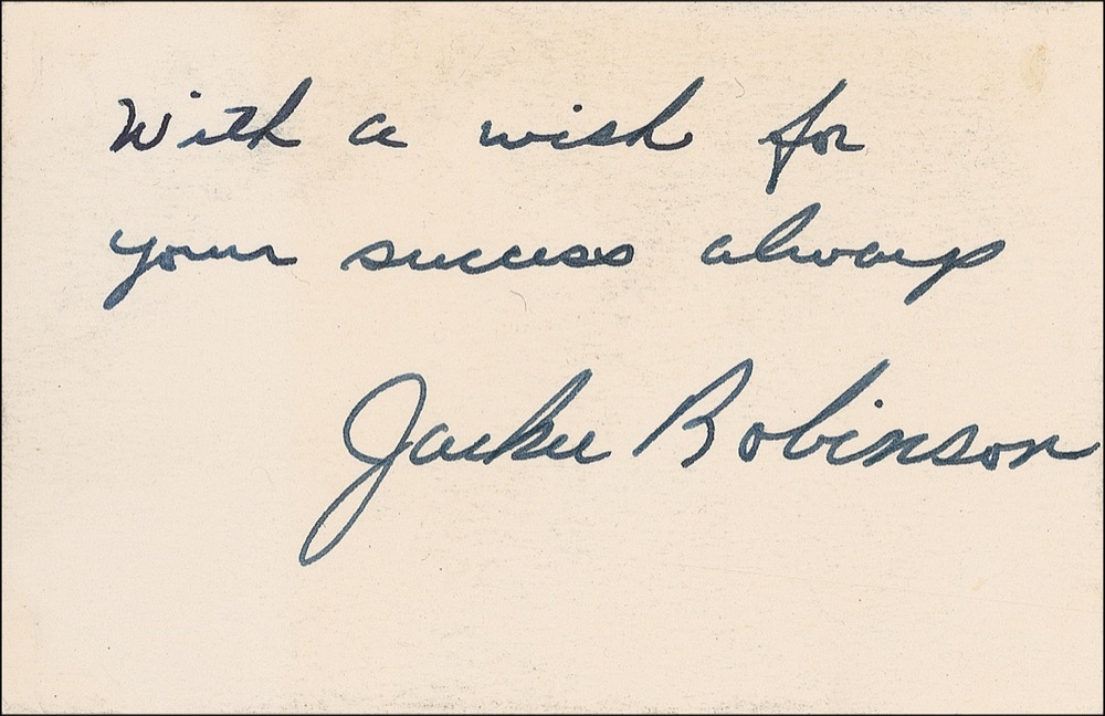 Vintage ink signature, “With a wish for your success always, Jackie Robinson,” on an off-white 3.5 x 2.25 card. A hint of very subtle soiling, otherwise fine, bright condition. Auction LOA Steve Grad/PSA/DNA and RRAuction COA.