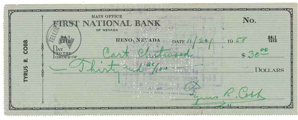 Personal check, 8 x 3, filled out and signed by Cobb, payable to Carl Chitwood for $30.00, November 20, 1958. Two vertical folds (one to first letter of signature), and usual punch and ink cancellations (the latter touching first few letters of signature), otherwise fine condition. Auction LOA Steve Grad/PSA/DNA and RRAuction COA.