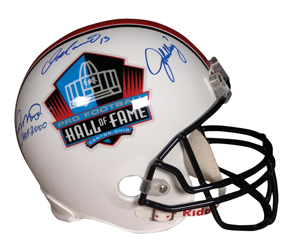 Official Riddell replica Pro Football Hall of Fame helmet, signed in blue felt tip “Joe Montana, HOF 2000,” “Dan Marino 13,” and “John Elway 7.” In fine condition. Auction LOA Steve Grad/PSA/DNA and RRAuction COA.