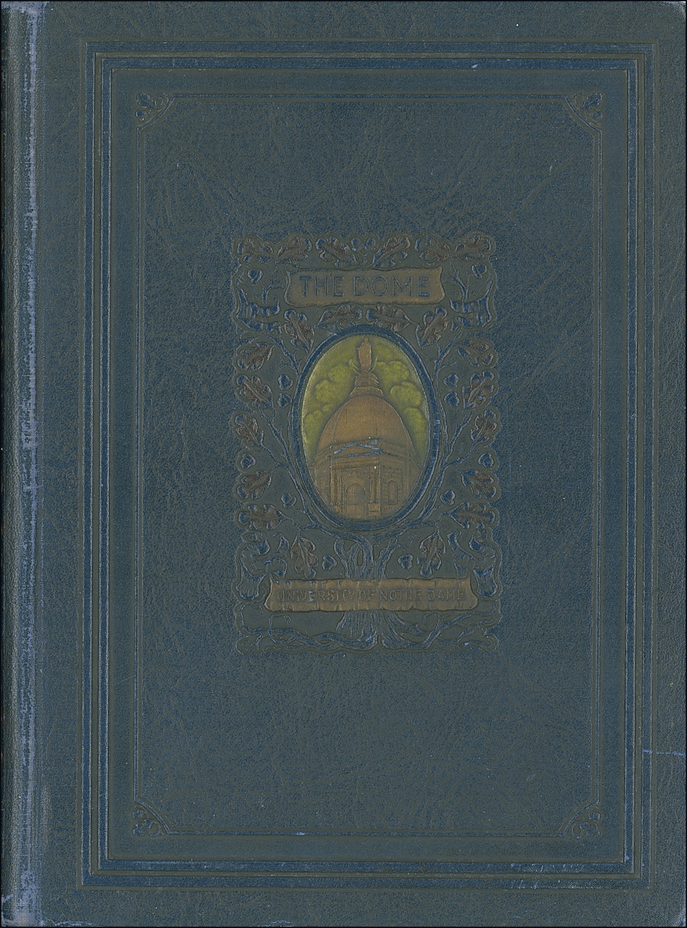Original copy of the 1923 Dome, the annual for the University of Notre Dame, hardcover, 8.25 x 11, 446 pages, signed in ink near their respective photos by Harry Stuhldreher, “Fool” Cotton, Bernie Livergood, Paul Castner, Ed DeGree, “Kentuck” Oberst, H. S. Brown, and John Weibel, several also adding a sentiment. Hinges cracked (but still attached), light rubbing and wear to covers, and mild scattered soiling to interior, otherwise fine condition. Auction LOA Steve Grad/PSA/DNA and RRAuction COA.